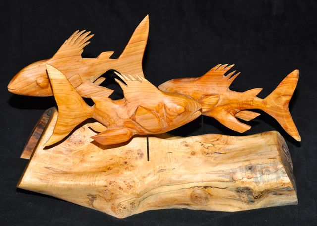| "Three Fish" carved from Red cedar, mounted on a base of spalted maple | ||