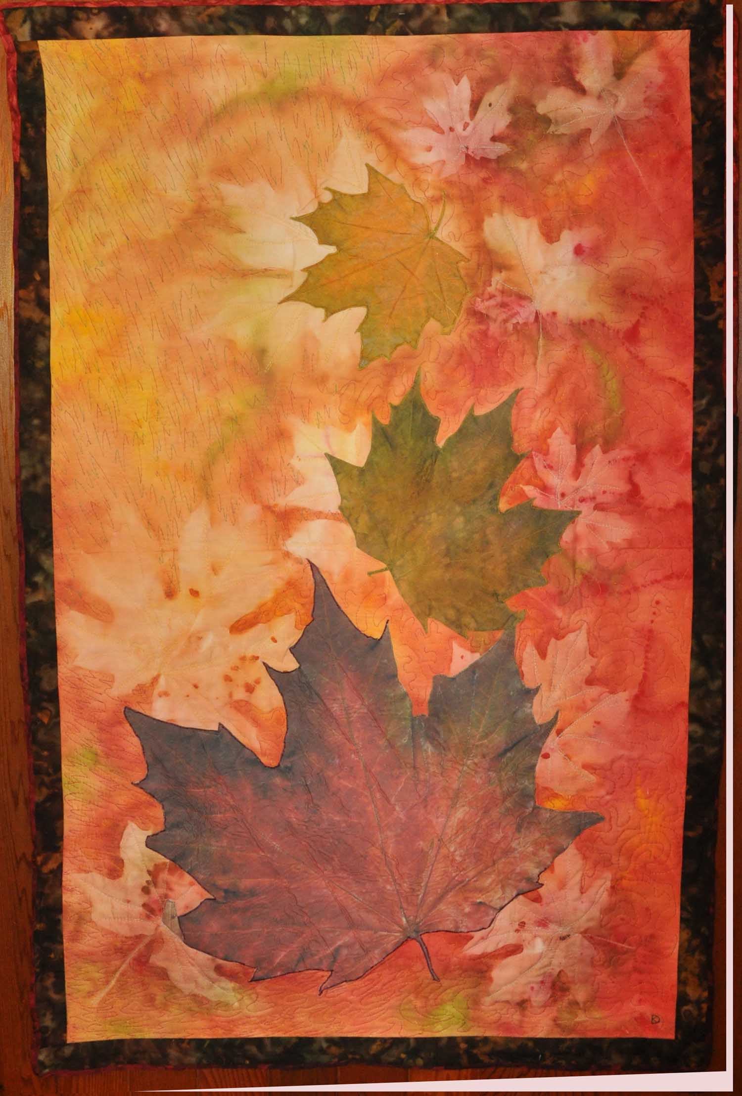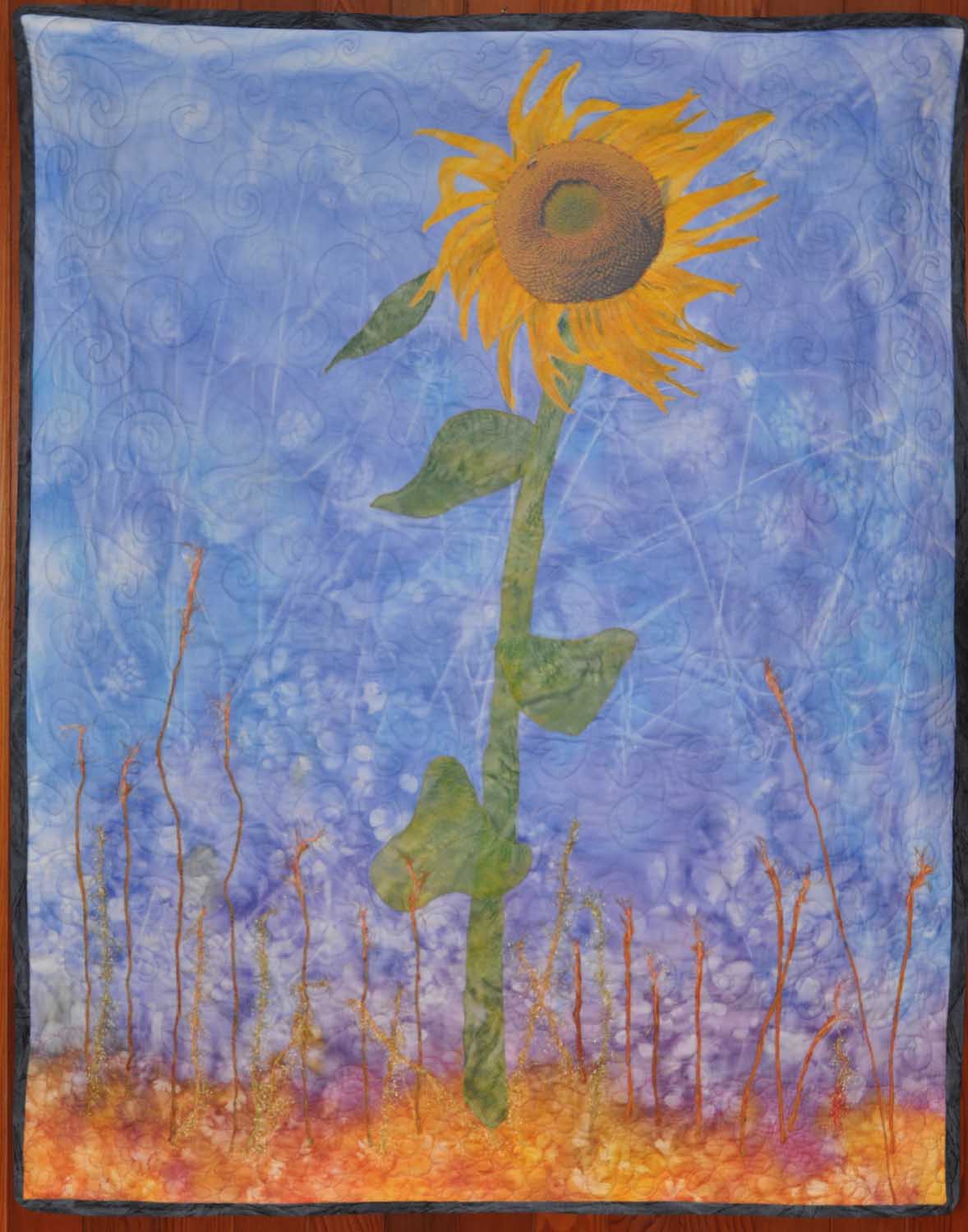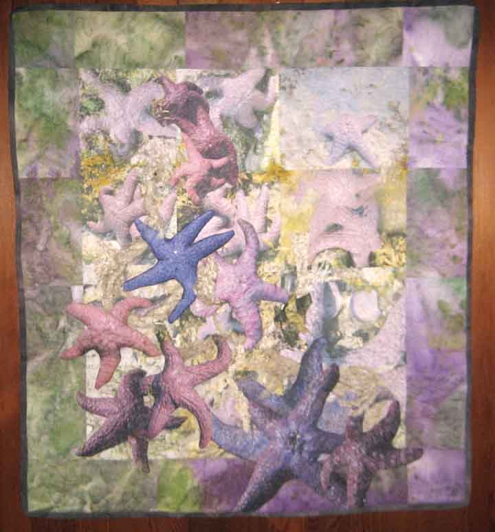 Size: 40" x 50" Materials: Cotton, Silk, Bamboo, Wool Technique: manipulated digital photos, ink-jet printed on EQ cotton sheets and collaged with sun dyed fabric, machine quilted