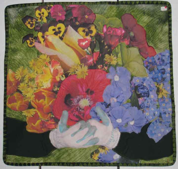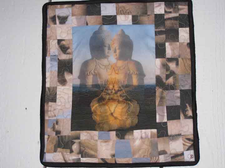 Size:33" x 37" Material: Cotton, silk, bamboo Technique: manipulated digital photos, ink-jet printed on EQ cotton sheets and collaged with batiks and sun dyed fabric machined quilted NFS