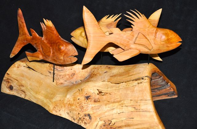 | "Three Fish" carved from Red cedar, mounted on a base of spalted maple | ||